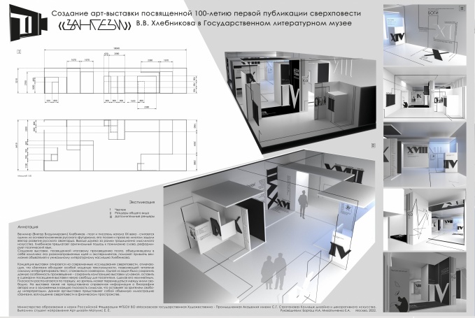 Проект «Создание арт - выставки посвященной 100-летию первой публикации сверхповести «Зангези» В.В. Хлебникова в Государственном литературном музее», автор проекта Матулис Елена, руководитель проекта Борташ Ирина Анатольевна, Колледж дизайна и декоративного искусства ФГБОУ ВО МГХПА им. С.Г. Строганова, Россия, Москва
