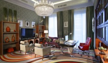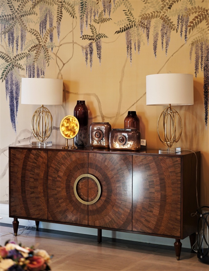 В гостиной наиболее уместным будет по-настоящему акцентный модный комод, например, богато декорированный ручной росписью в восточном стиле или изысканный экземпляр, словно прибывший из дворца венецианского вельможи. Такой комод будет выполнять декоративную функцию и к тому же служить хранилищем для коллекции старинного фарфора или постаментом для красивых настольных ламп, ваз с цветочными композициями.
