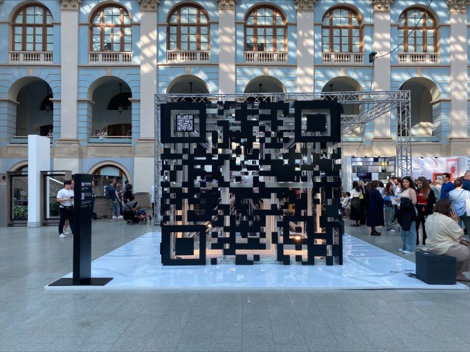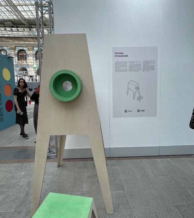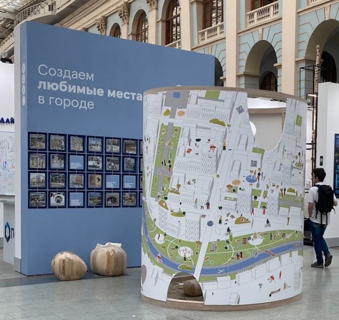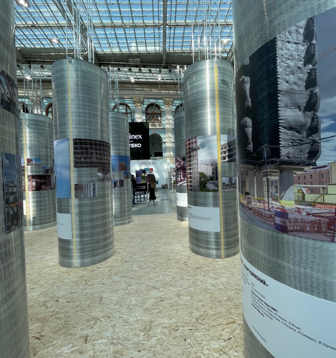 Демонстрацию происходящего в городе «по-взрослому» представил проект «Москва на стройке». В качестве основы для демонстрации объектов использованы мощные круглые колонны. Одна колонна – один строящийся объект: 18 колонн -18 объектов, отражающихся при этом в зеркале… Что создает безграничную перспективу… Масштабно во всех отношениях! И, главное, формирует абсолютно реалистичное ощущение роста в моменте.