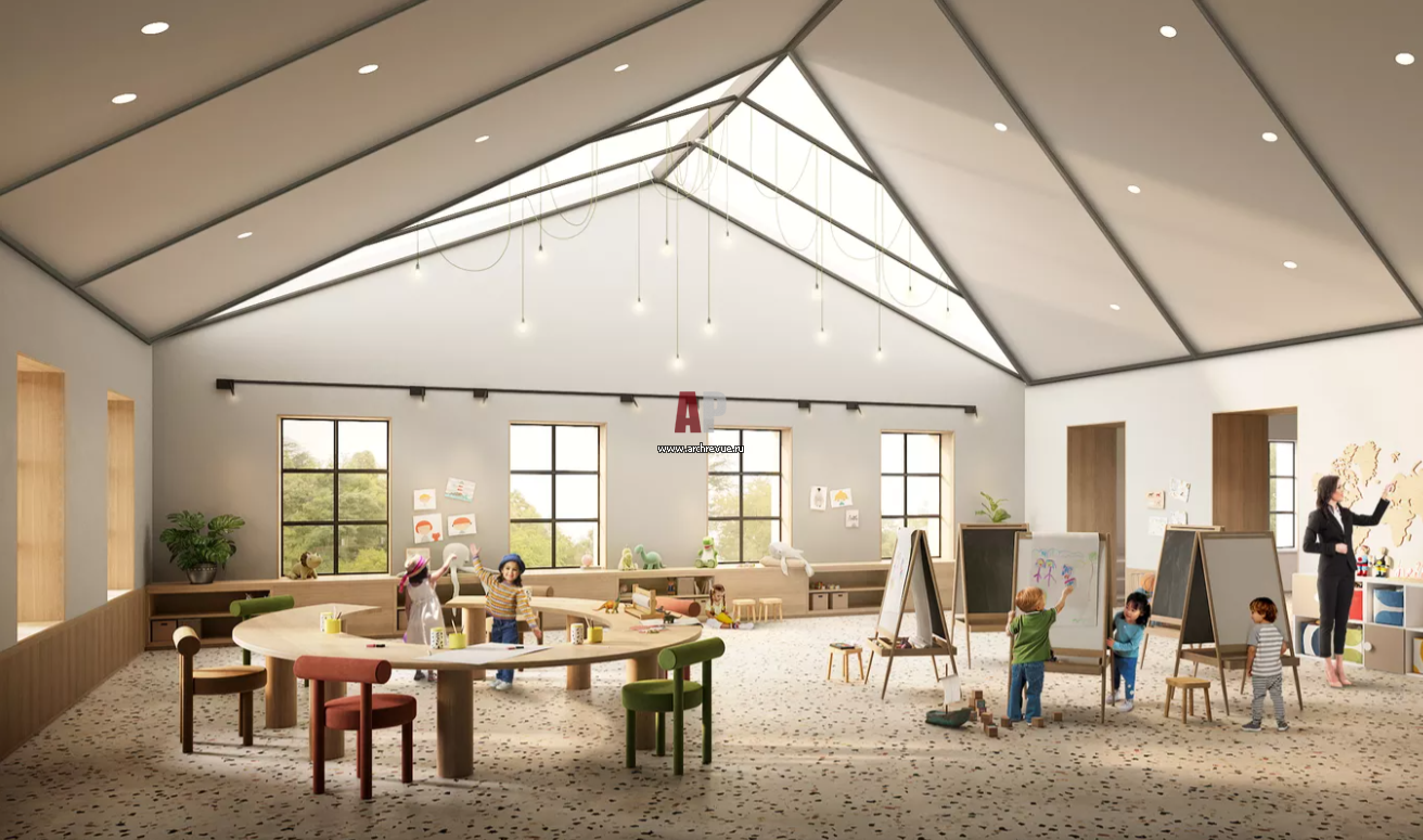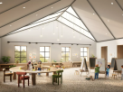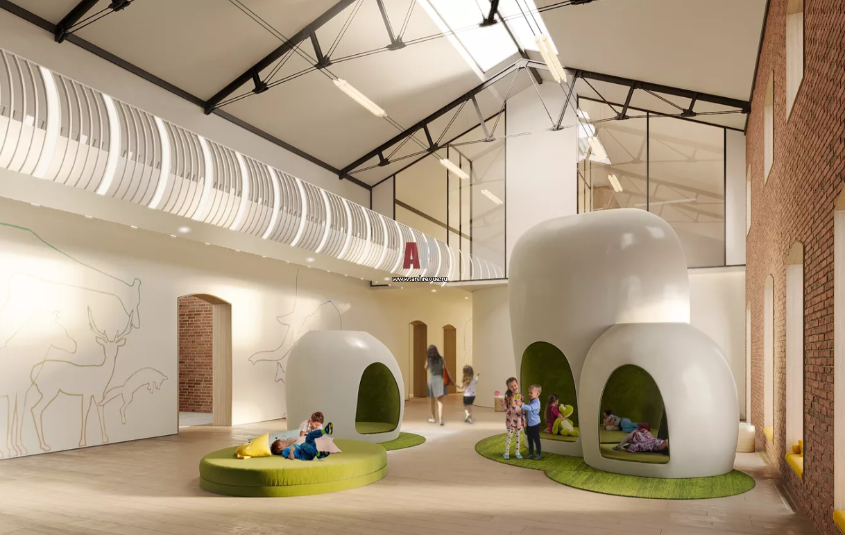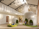 На первом этаже детского сада будут организованы пространства для детей младшего возраста, спортивный и актовый залы, игровые. Второй этаж отведен для старших. Там предусмотрены зал искусств, класс науки и математики.