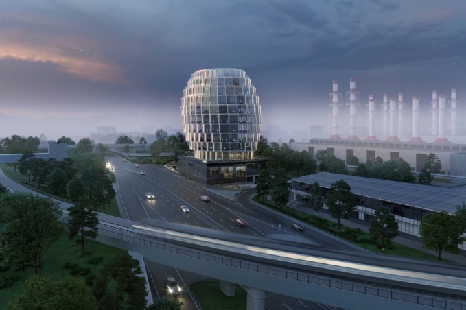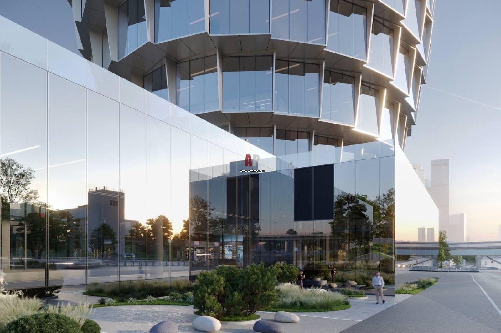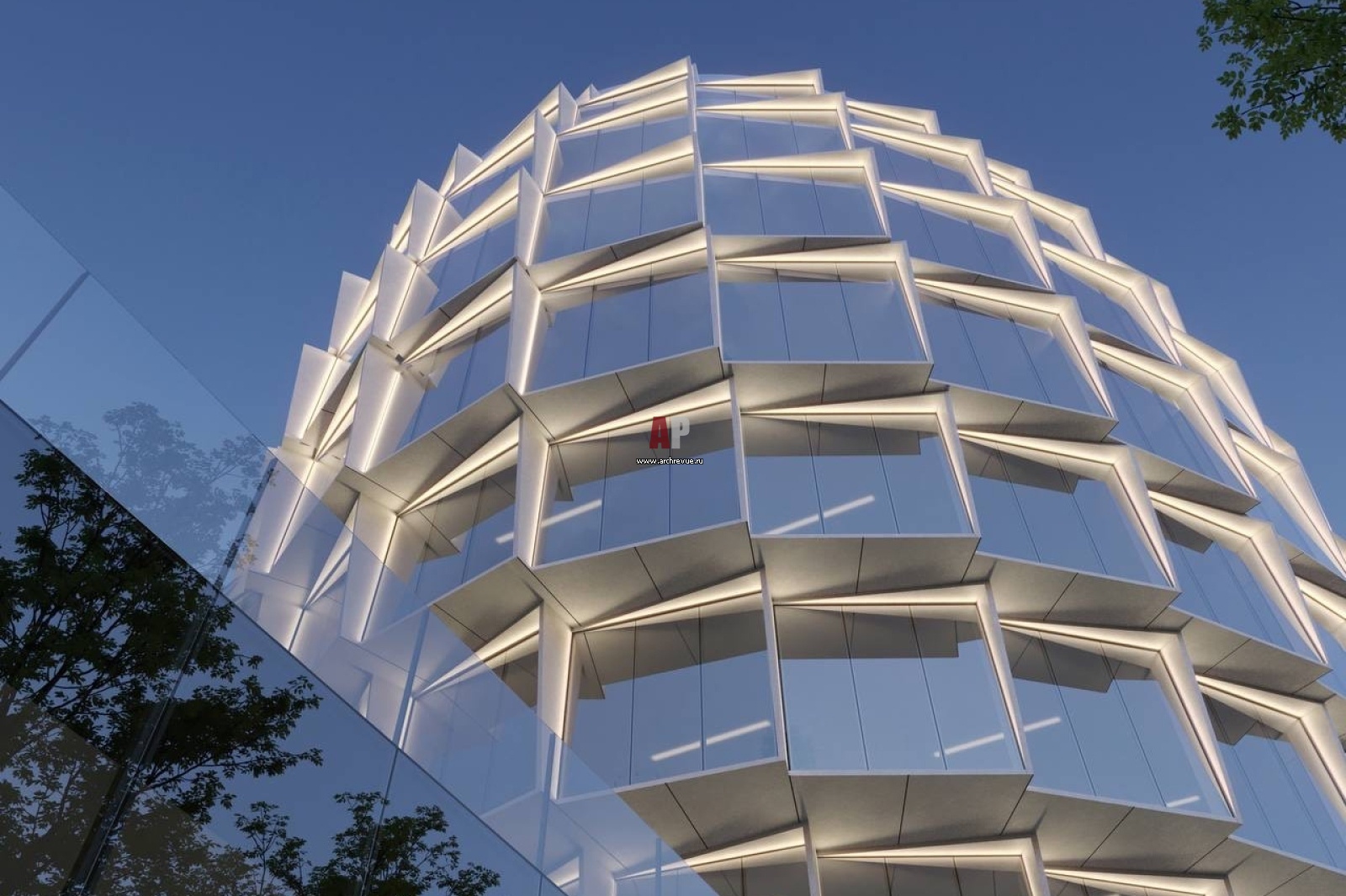 11-этажное здание с основным стеклянным объемом овальной формы расположится на эффектном стилобате сложной ступенчатой формы. Оно будет отделано панелями-чешуйками стального цвета и структурным остеклением. Первый этаж отдан торговым помещениям и физкультурно-оздоровительному комплексу с бассейном, остальные пространства займут офисы. Два подземных уровня предназначены под паркинг.