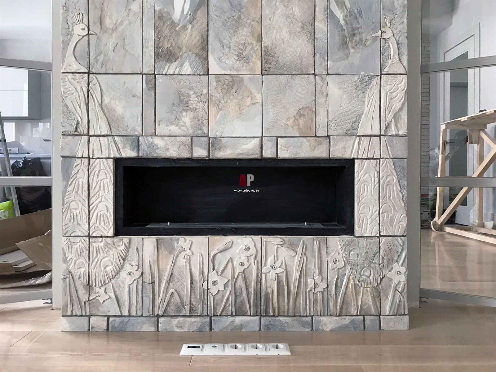 Облицовка камина для квартиры в Москве (Россия), художник Наталия Лаптева, номинация «Лучший реализованный проект фасада или интерьера с использованием керамики».