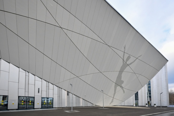 Акцент фасада - навес, установленный под углом примерно 35 градусов, он добавляет композиции динамику и выразительность, создает четкую и мощную параболическую линию, которую видно издалека. Эта линия символизирует напряжение и силу, характерные для спортсменов, борющихся с гравитацией на льду или в воздухе. Дизайнерское решение козырька напрямую связано с фигурным катанием: повторяет форму острия конька и символизирует само ледовое поле, на котором читаются узоры, повторяющие следы от коньков (изображения выполнены в технике перфорации). Цементирует концепцию 8-метровая скульптура фигуристки, созданная по эскизам архитекторов после тщательных обсуждений со скульпторами и функциональными заказчиками. Она служит символом того, чем живет этот объект, и вместе с тем становится связующим звеном между монументальной скульптурой и современной архитектурой — принцип, известный еще с античных времен, но редко используемый сегодня. Утонченная, словно фарфоровая фигуристка отбрасывает «тень» на фасад здания, недвусмысленно обозначая его принадлежность.