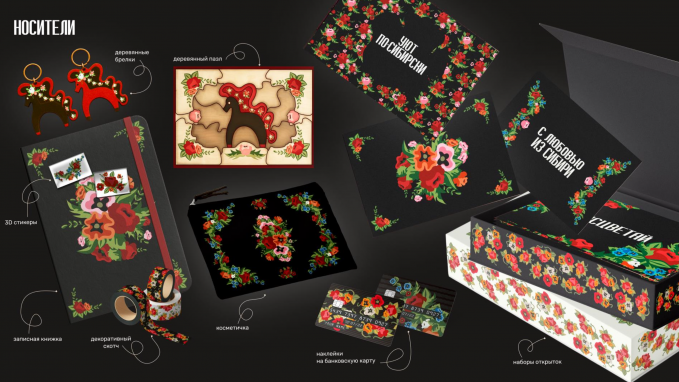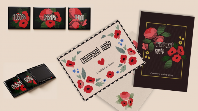 Команда-победитель для бренда «Сибирская ковровая фабрика» «Дизайнозавры» создала креативные концепции мерча, отражающие традиции и культуру сибирского коврового промысла. Дизайнеры перенесли традиционные яркие цветочные орнаменты сибирских ковров на платки, шоперы, блокноты, наклейки, открытки, косметички, термокружки.