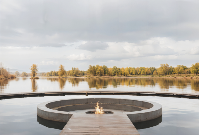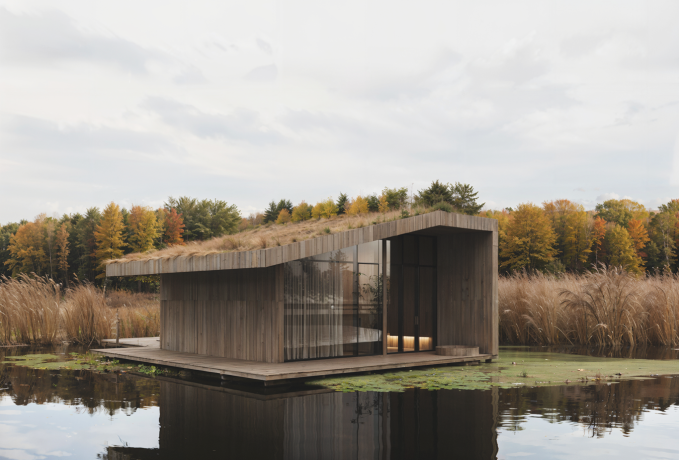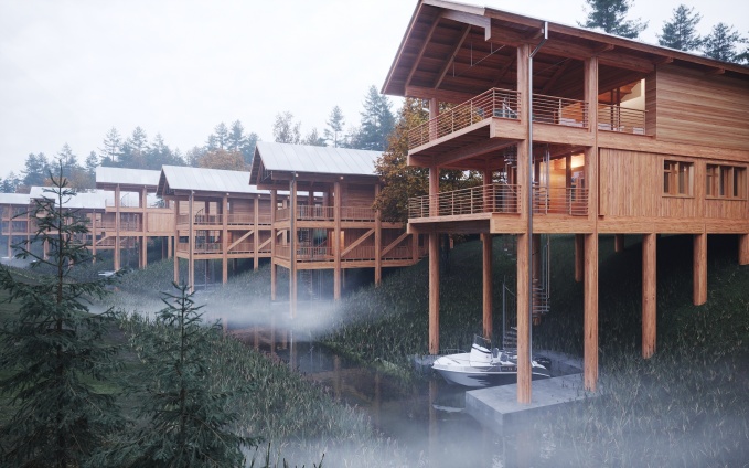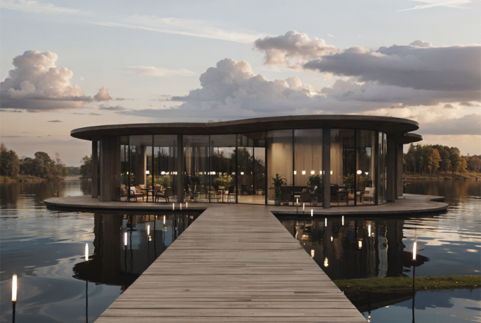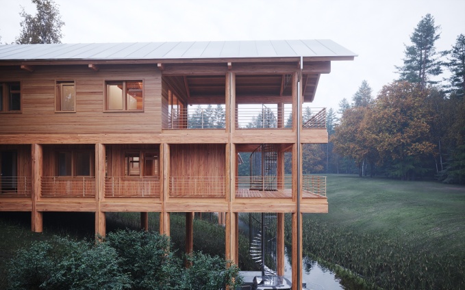 Архитектурная концепция направлена на удовлетворение разных потребностей человека в отдыхе. Первая – это отдых без когнитивной нагрузки, воплощенный в центрах спа центре и медитации, чьи пространства отличает строгость и даже аскетичность. Второй образ отдыха – снятие напряжение, расслабление и умиротворение. Домики для проживания создают безопасную среду, это место, где фокус внимания смещается на комфорт: тактильно теплые материалы, камерность, приглушенный свет. На территории также располагается необычное строение – кафе с волнообразным стеклянным фасадом, панорамой раскрывающееся на 360 градусов. Изгибы имитируют естественные контуры болота, создавая гармоничную взаимосвязь между зданием и окружающей средой.