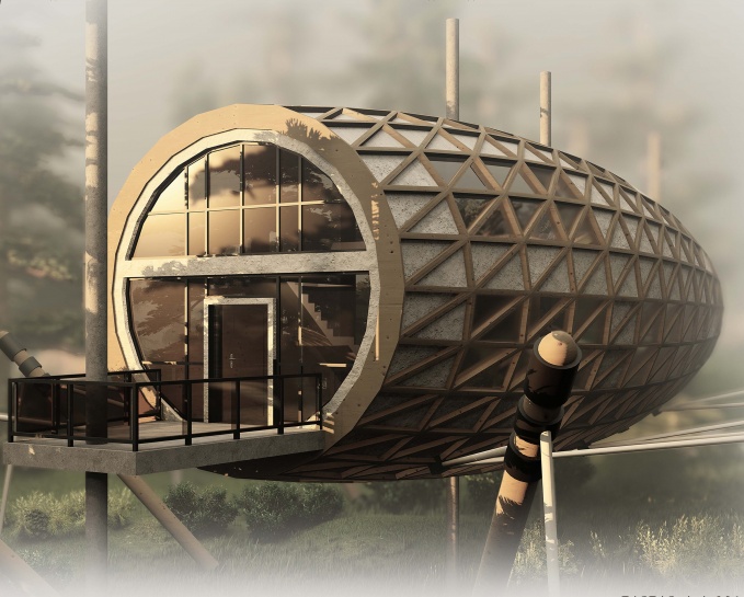 Дом для отдыха «Гамак» представляет собой уникальное сочетание современного дизайна и функциональности, предназначенное для круглогодичного и временного проживания от 1 до 6 человек. Вдохновением для архитектурной формы служит образ гамака. Форма дома перекликается с лёгкостью, расслабленностью и чувством невесомости, которое возникает при отдыхе в гамаке. Визуально здание словно «парит» над землёй благодаря использованию натянутых вант между несущими пилонами и основным каркасом дома, удерживая его в подвешенном состоянии. Ванты работают на растяжение, принимая на себя нагрузку от веса здания и распределяя её на опорные элементы. Такое решение усиливает ассоциативную связь с гамаком, и минимизирует воздействие на природный ландшафт, позволяя дому органично вписываться в окружение — будь то лес, склон или поле.