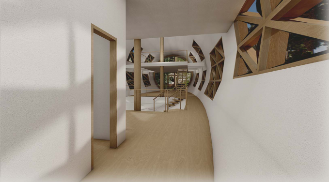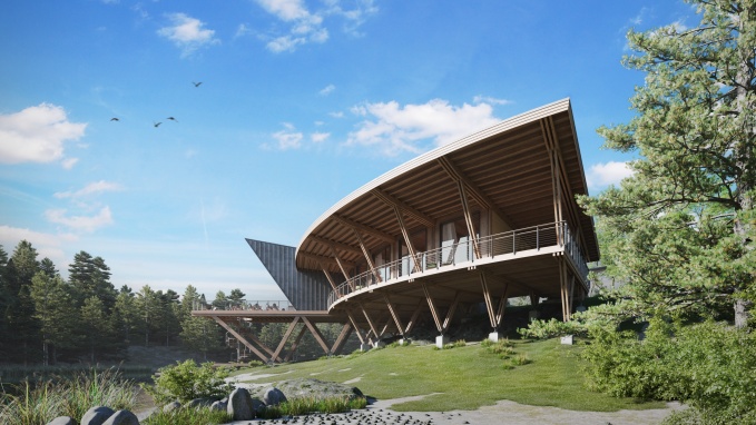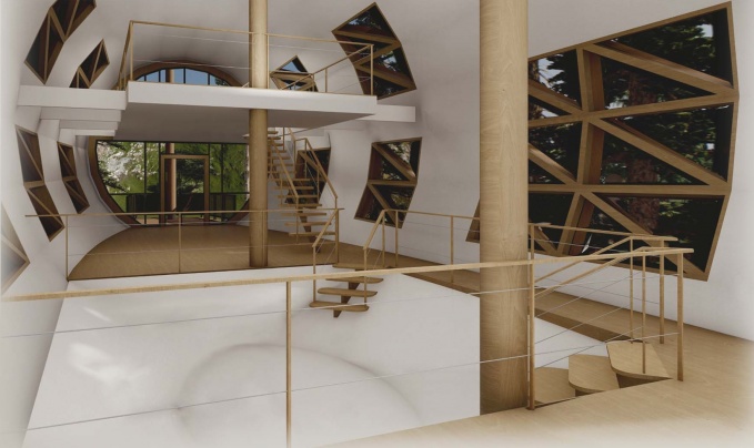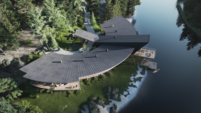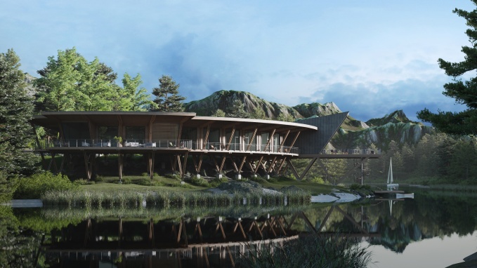 В плане здание представляет собой сегмент окружности, огибающий берег чистейшего озера. Большой перепад рельефа позволил поставить мини-гостиницу на изящные высокие деревянные опоры, что подчеркивает образ ажурной драгоценности. Мини-гостиница разделяется на две части выступающим над водой объемом. С одной стороны расположены просторные и комфортабельные номера с балконами. С противоположной стороны – технические помещения. В разделяющем объеме запроектирован обеденный зал с возможностью выйти на большую летнюю террасу, высоко парящую над водой, с которой по винтовой лестнице можно спуститься на небольшой причал. Здание мини-гостиницы представляет собой легкий деревянный каркас. Пространственную жесткость обеспечивают многочисленный связи из незаметных металлических стержней. Монолитные железобетонные столбы фундамента минимально нарушают почвенный