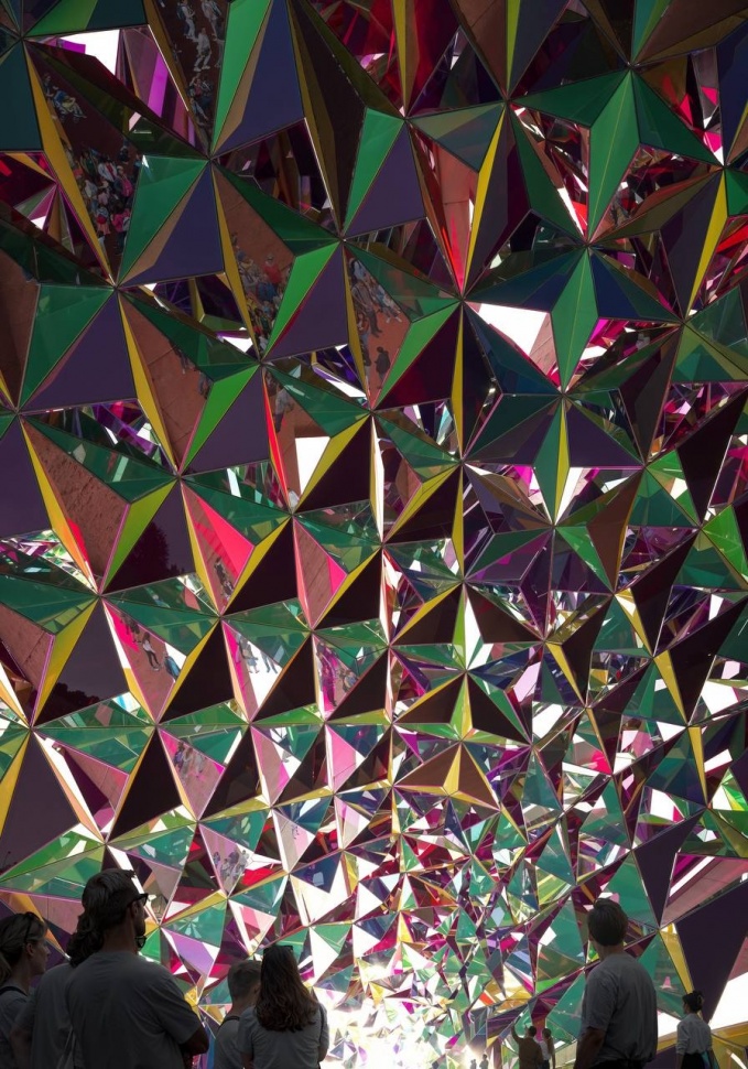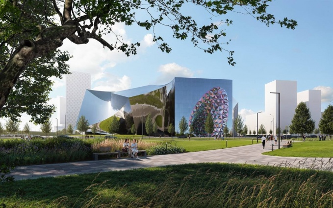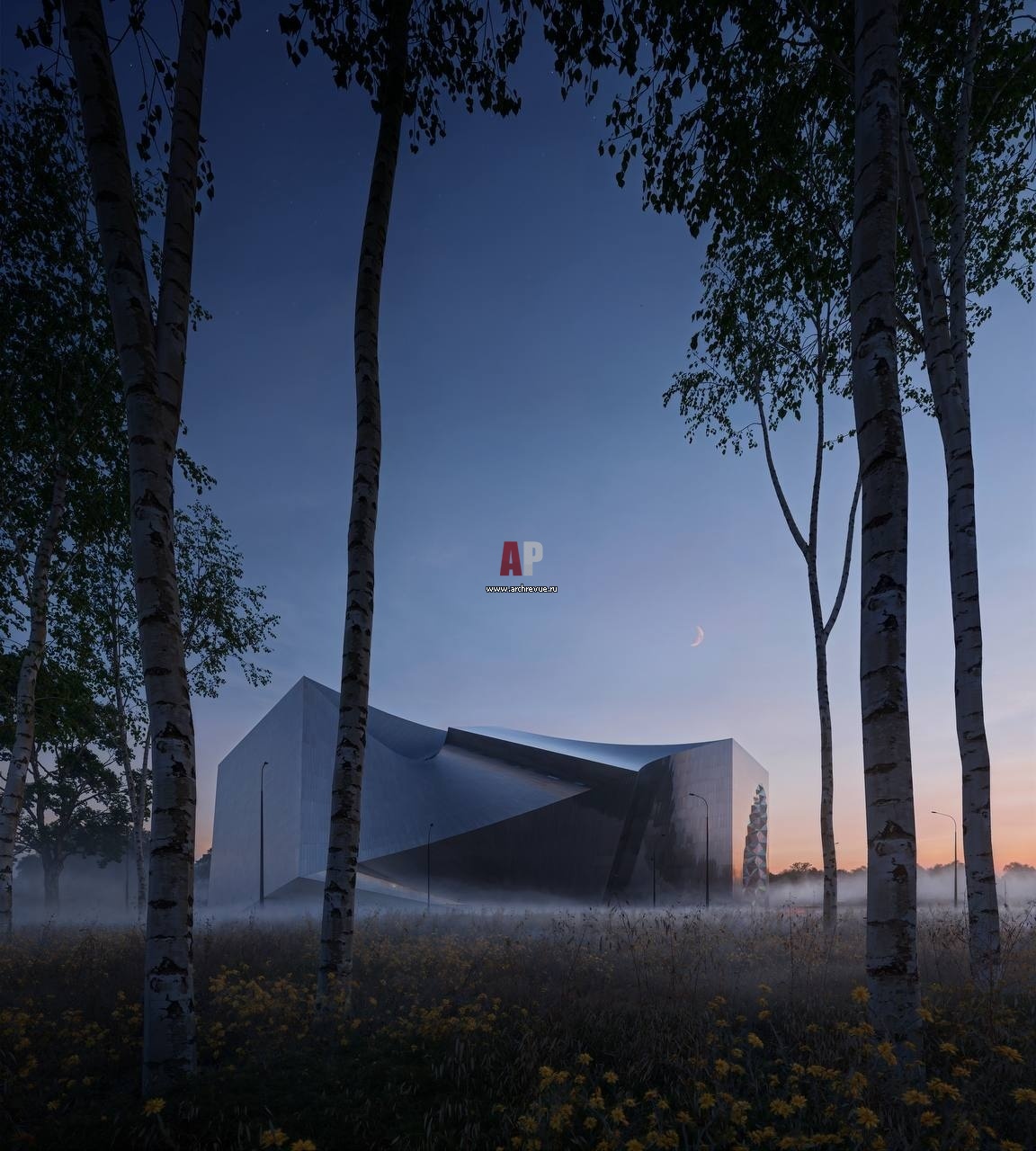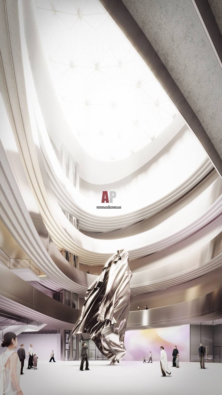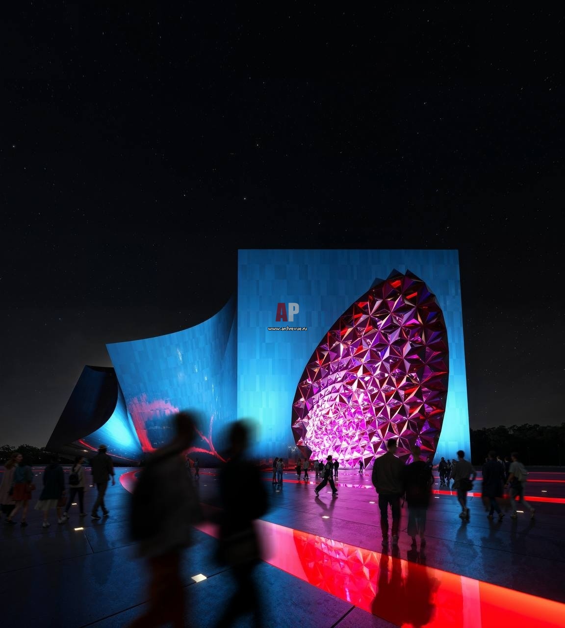 Концепция проектного бюро АПЕКС сформулирована на острие искусства и науки. Центр как пространство смыслов. Произведение искусства и взаимодействие с наблюдателем. Фасад реагирует на присутствие человека: электрохромное стекло меняет прозрачность, поверхности с голографическими эффектами накладывают разные состояния, усиливая эффект квантовой неопределённости.
