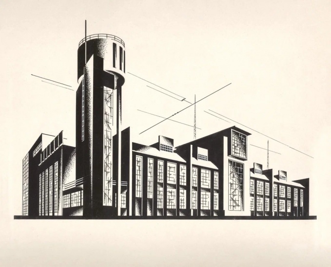 Канатный цех N-го завода (1 вариант). Архитектурная фантазия № 329 из цикла «Конструкция архитектурных и машинных форм», 1927 - 1930, Архитектурный благотворительный фонд имени Якова Черних