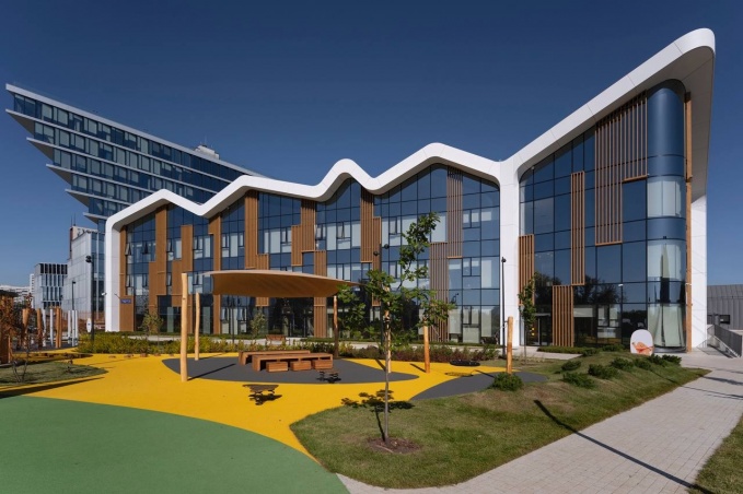 Детский «квартал» авторы назвали «Городок». Домики с двускатной крышей сохраняют традиционный для всего кампуса силуэт, отделка фасада выполнена с использованием панелей с текстурой дерева. В то же время «Городок» выглядит футуристично: отдельные блоки слиты в один или несколько крупных, создавая плавную линию кровли; появляется масштабный витражный фасад из изогнутого моллированного стекла.