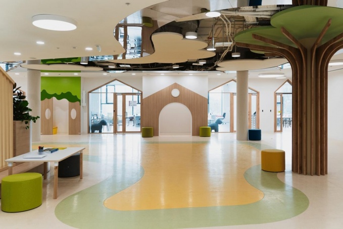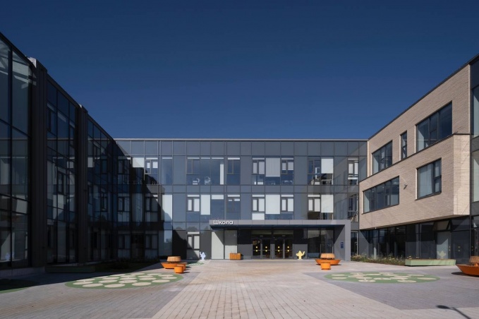 Проектируя комплекс, архитекторы создавали комфортные условия для разных детей. Так, для интерьеров дошкольного отделения были выбраны натуральные материалы и яркие цвета, формообразование с отсылкой к идее городка. В средней школе, адаптированной под технохаб, предусмотрены натуральные материалы, световые акценты и более сложная цветовая гамма с градиентами.