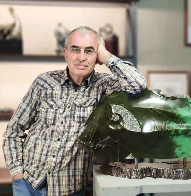 Моя первая объемная работа - «Лось» выполнена из нефритоида. На Антикварном Салоне 2025 мы выставляем совсем недавно законченную, последнюю из станковых на сегодняшний день работу «Саванна» из авантюрина высотой 1085 мм…