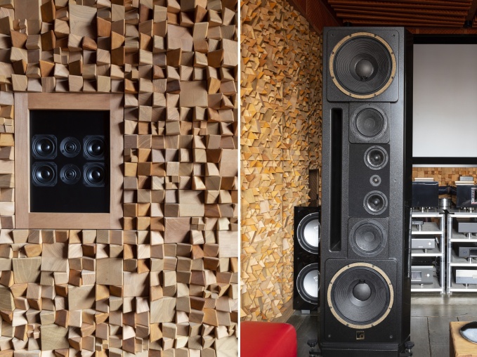 На одном из проектов для аудио-комнаты были изготовлены специальные звукопоглощающие панели. Кубики из древесины со спилами под разными углами изготавливались из 6 сортов древесины: дуба, ясеня, сосны, липы, ольхи… У всех разная плотность, и звук проходит по-разному. Каждый кубик пропитывается антибактериальным и противопожарным химическим составом. Под разными углами кубики собираются на фанерную подложку, к которой приклеивается звукопоглощающая панель. Панель крепится к стене, которая не гладкая, а с зубцами.