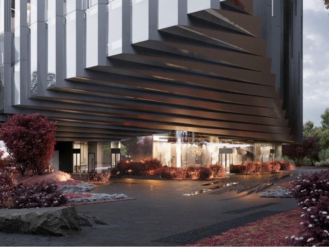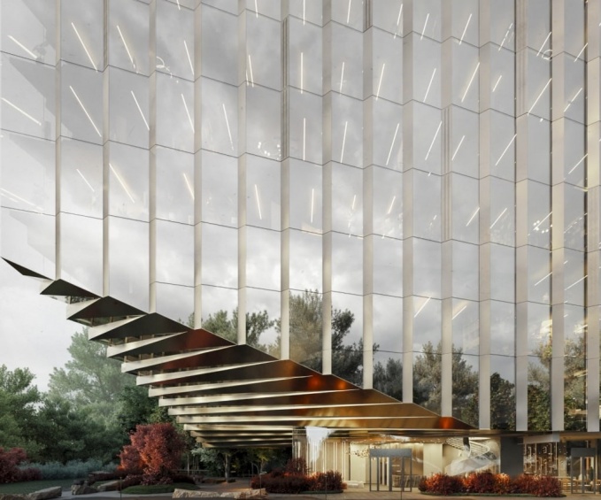 Потолок консоли выполнен в той же системе преломлённых граней, что и фасад, с использованием металла тёплого латунного оттенка. Это решение создаёт уютную, приглашающую атмосферу и подчёркивает выразительность архитектурного образа.