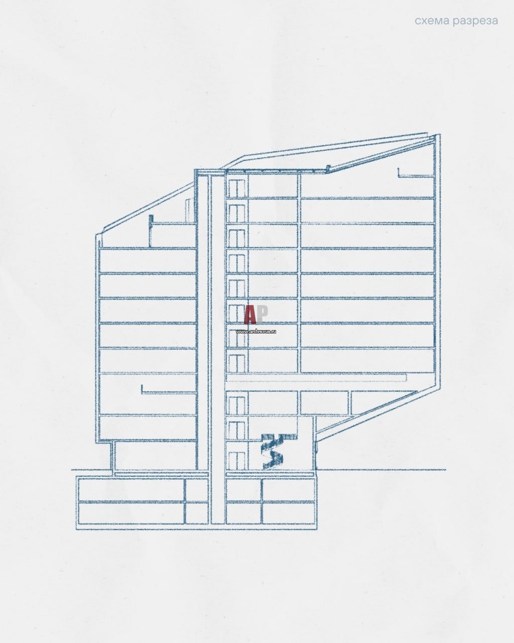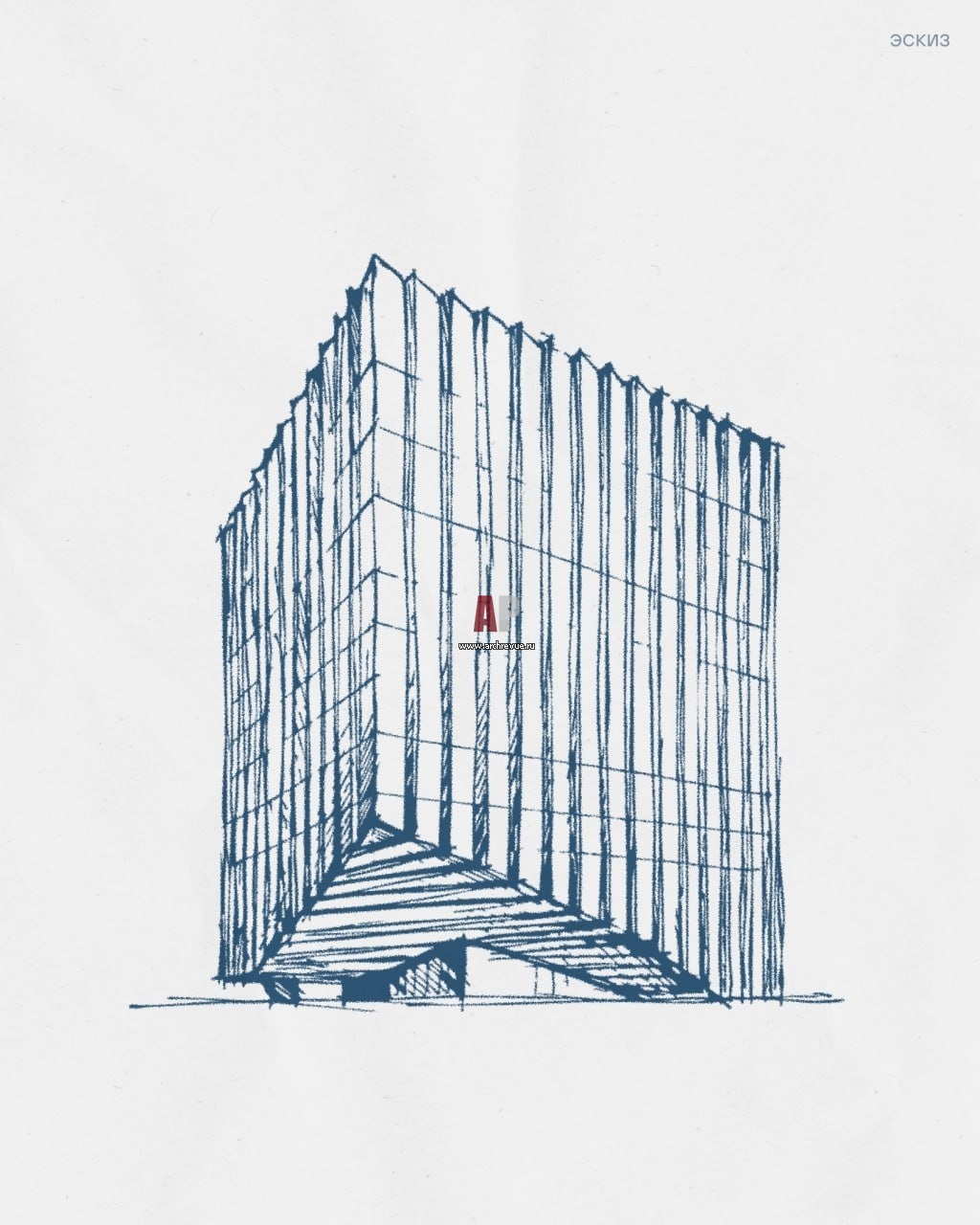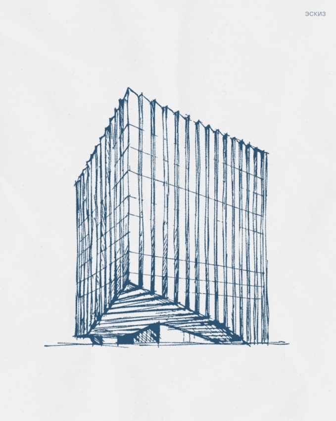 Один из углов куба приподнят и ориентирован на перекрёсток улиц — в сторону Останкинской башни. Этот угол формирует крупную консоль, визуально парящую над холмом. Под ней расположен главный вход в здание.