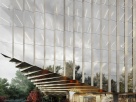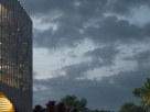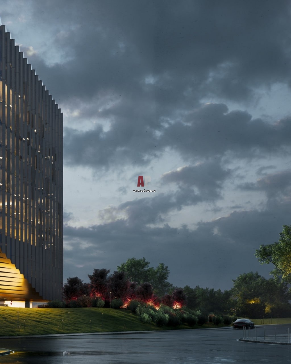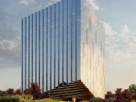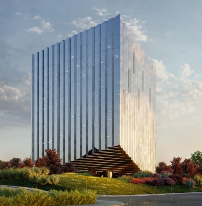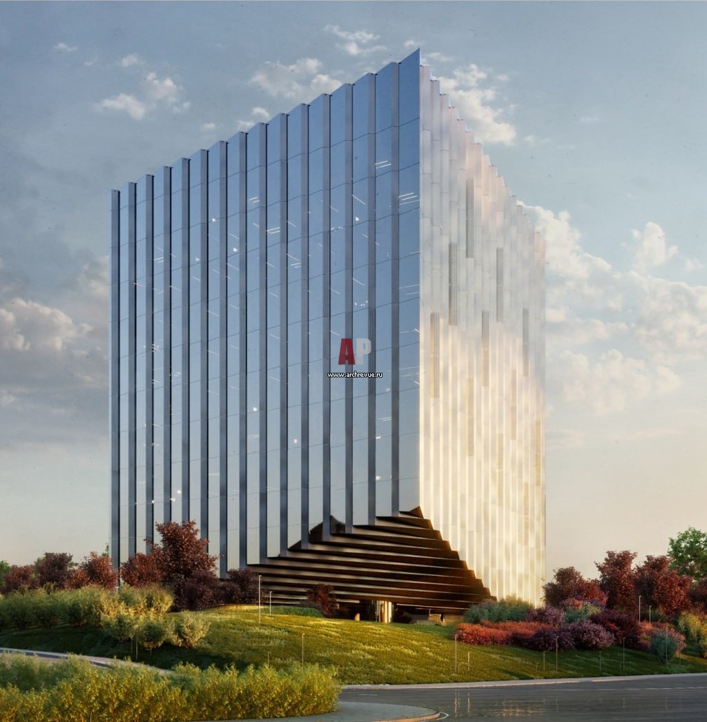 Образом проекта служит хрустальный многогранный куб — словно камень на багрово-зеленом холме, переливающийся стеклянными зубчатыми гранями и играющий светом.