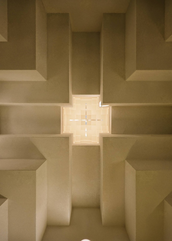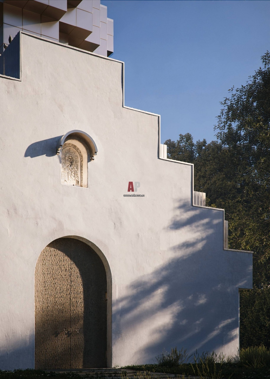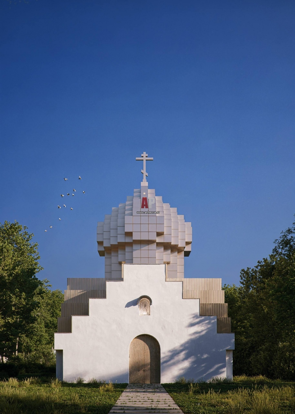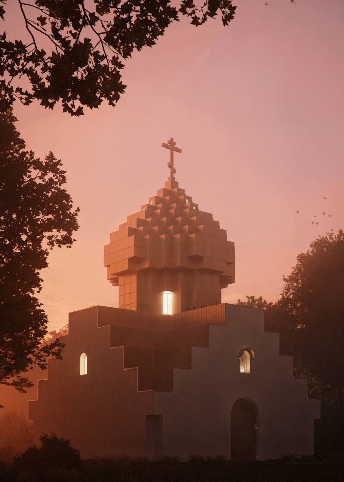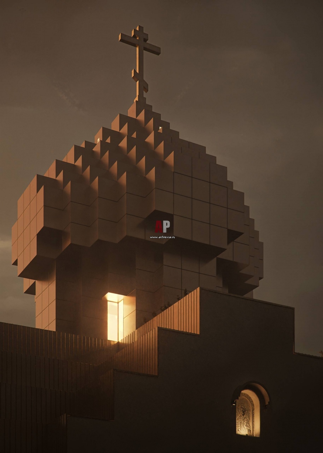 Кубические формы стен, пиксельный купол и крестовая геометрия внутри, увенчанная крестом на выходе – в поднебесье. Проект содержит глубокие отсылы к историческим храмовым образцам православной архитектуры и предлагает современную версию размышлений на тему храмового зодчества