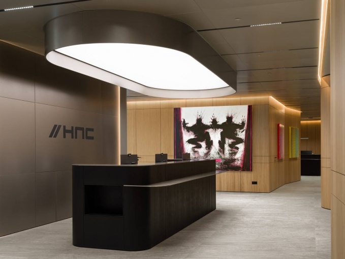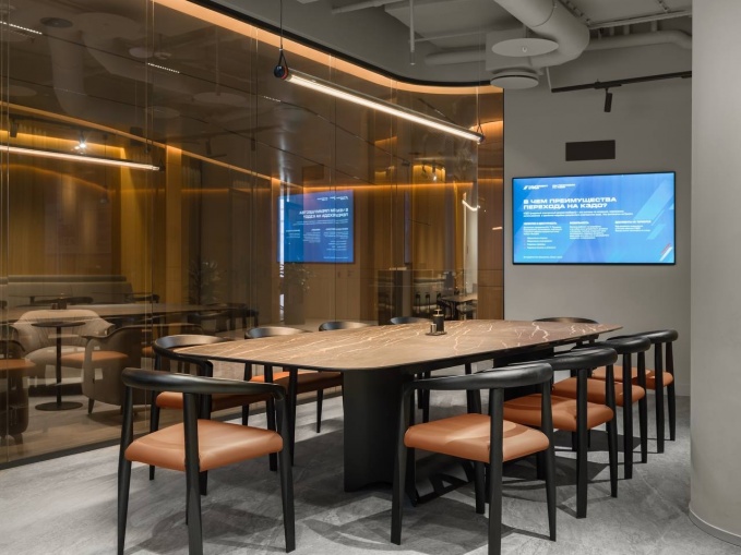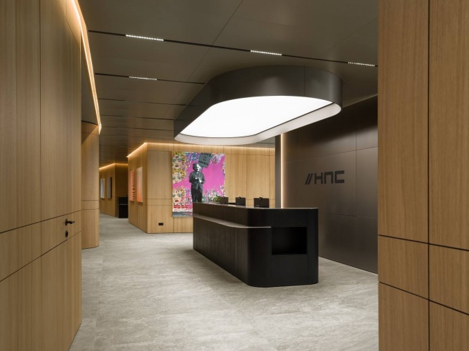 «Для решения первой задачи мы выбрали металлизированные панели и крупные пятна лайтбоксов. Для решения второй — стеновые панели в отделке натуральным шпоном и эргономически комфортную мебель из натуральной кожи», — рассказывает руководитель отдела интерьеров IND Юлия Парфенова.