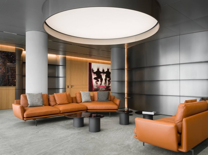 Работа над проектом офисного вип пространства Группы компаний «Нацпроектстрой» площадью 2180 кв.м включала две основные задачи: создать выразительные приветственные зоны, транслирующие уверенность и прогрессивность руководства компании, а также реализовать комфортную среду для работы руководящего состава.