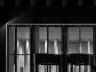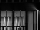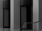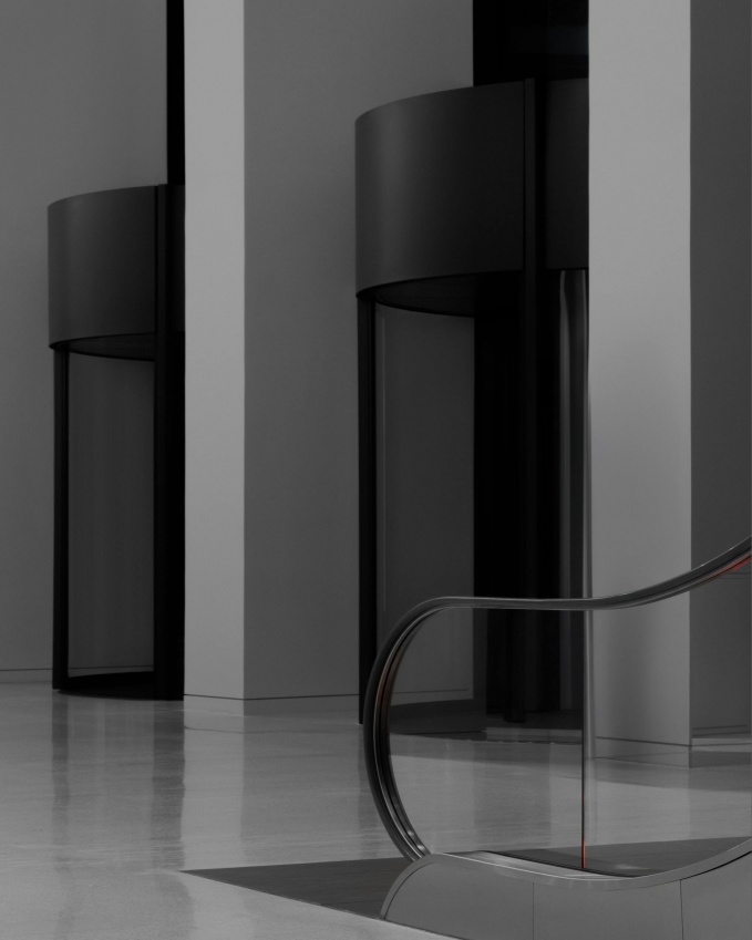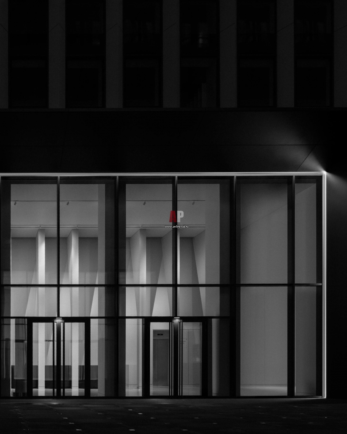 Лобби башни организовано сложными по форме колоннами. Их ритм определил композиционное решение. А основная цветовая гамма построена на сочетании серого и черного. Контрасты металла, натурального камня и ткани создают акценты в монохромном пространстве.