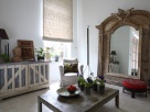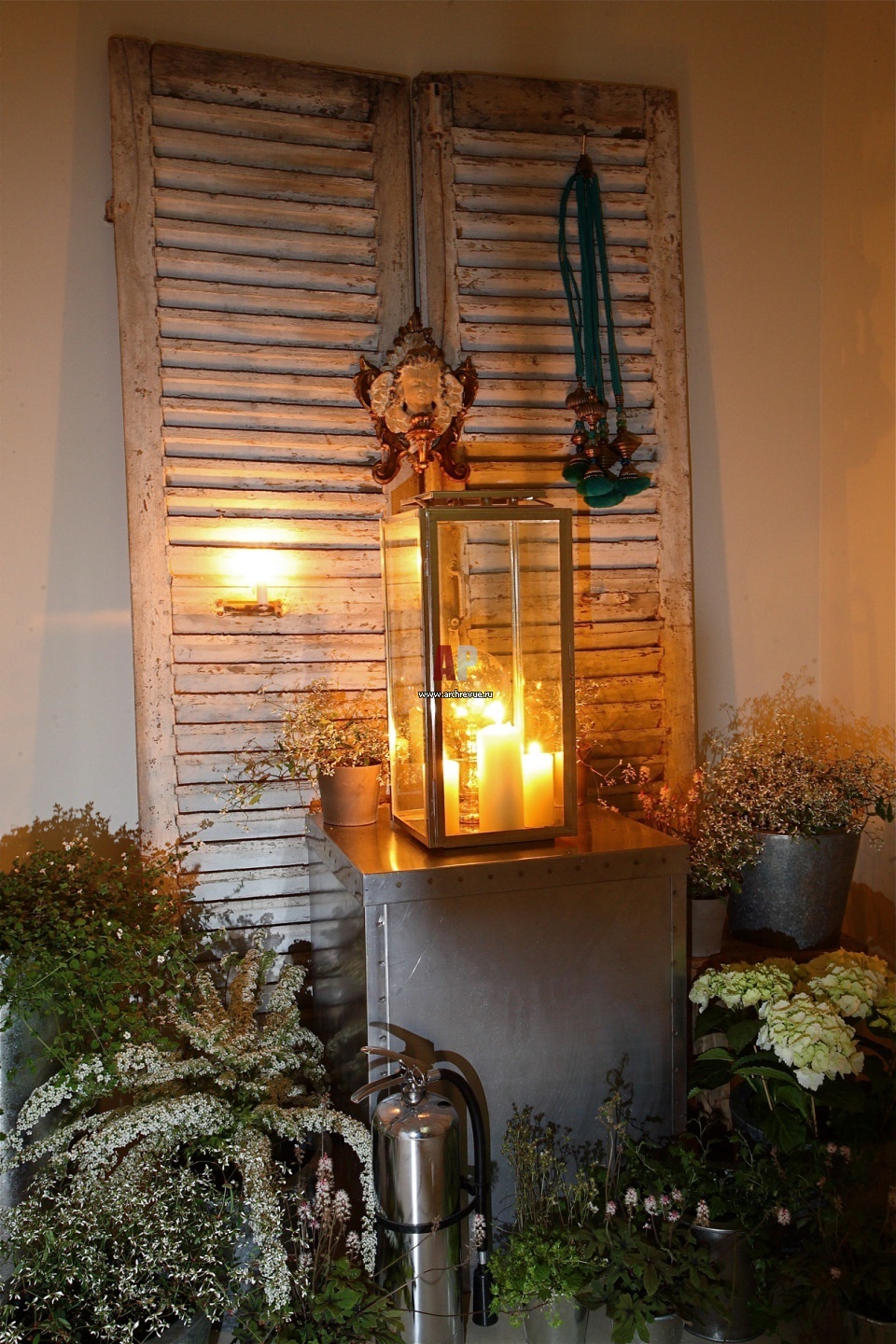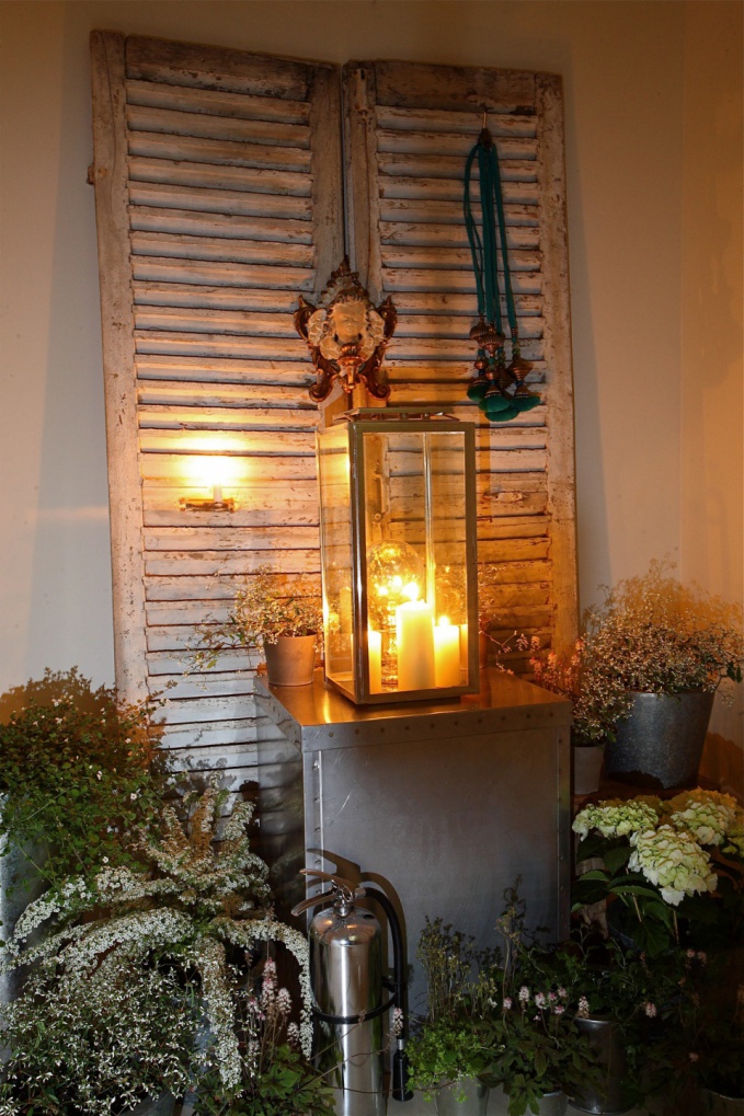 На объекте я использовала старые жалюзи, украшавшие когда-то фасад парижского дома. Они создают интересную композицию в помещении зимнего сада. Благодаря им в пространстве возникает некий сюжет