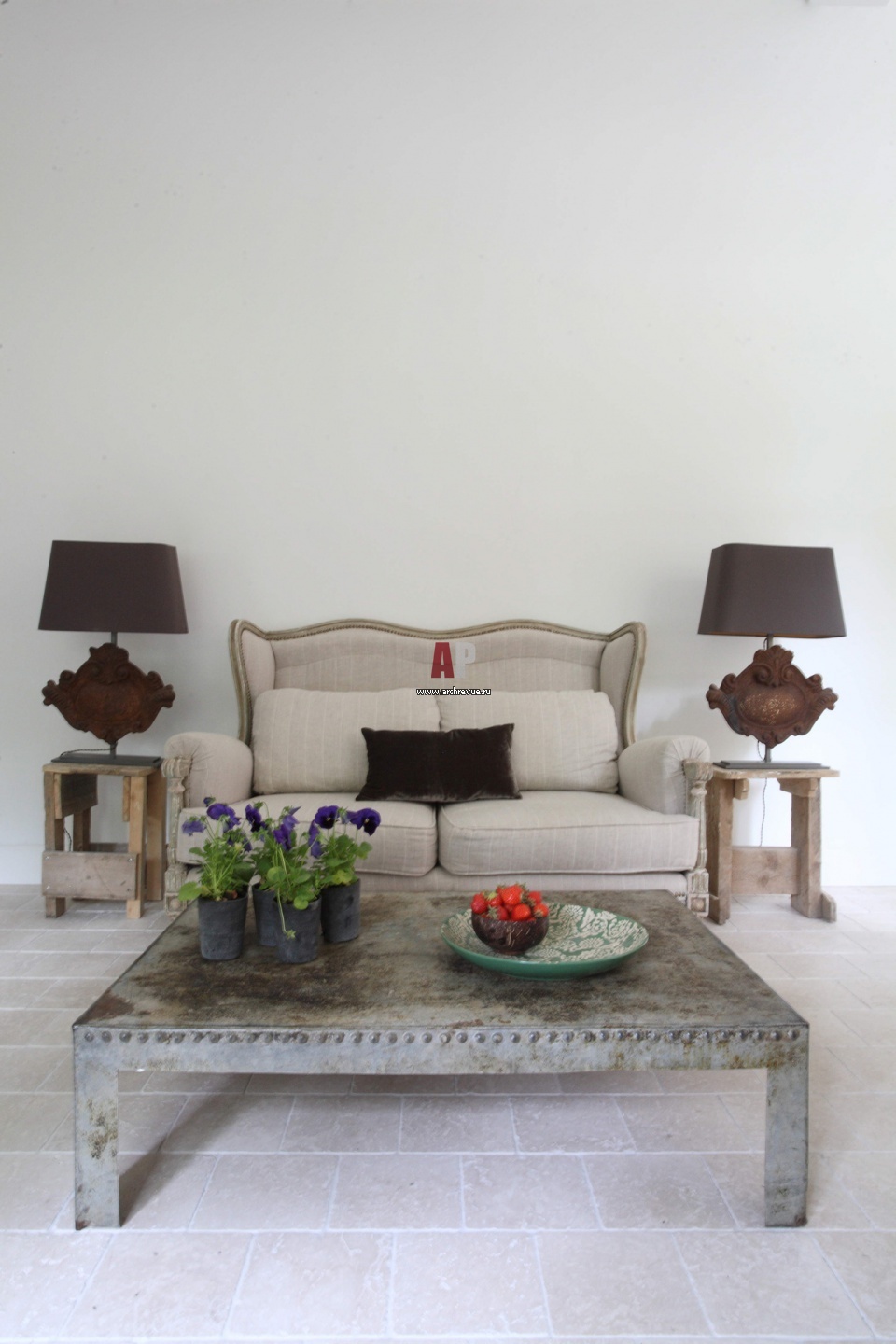 Светильники сделала специально для этого проекта. Декоративные элементы старинных ворот приварены к технологичному основанию. Лампы стоят на старинных табуретках, которые оставили строители после ремонта. Богатейшая фактура – такие не найдешь. Очень живописно! Диван тоже антикварный. Выбрала его за невероятное удобство. Ткань перетянула, подобрав к общей гамме. Сталь, из которой выполнен стол, очень почтенного возраста. Ей придали современную форму, которой удобно пользоваться.