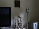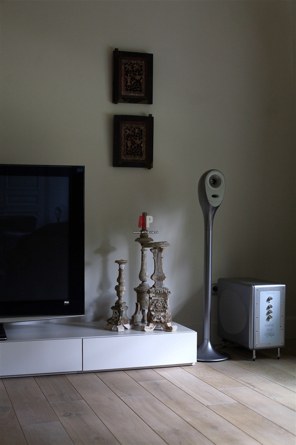 Космический дизайн колонок, разработанный английским дизайнером, отлично сочетается с 3 подсвечниками, случайно приобретенными на антикварном рынке в Париже. А над этим ансамблем – 2 картинки – это китайские ставни, которые вставлялись во входные двери. Ставни ХV века. Ажурная дощечка выдвигалась, и образовывался «глазок», в котором хозяин дома мог видеть пришедшего.