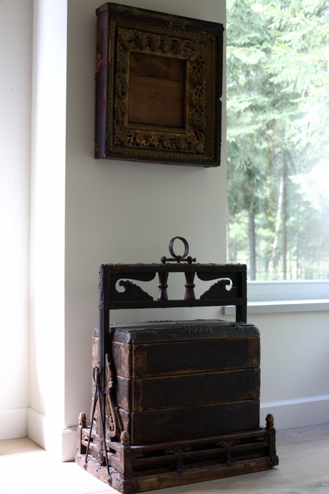 Это китайская шкатулка с выдвижными ящиками для вещей, которые редко достаются. Ей лет 300! Сверху церковная рама. Фактуры этих предметов удивительно живописны и отлично сочетаются.