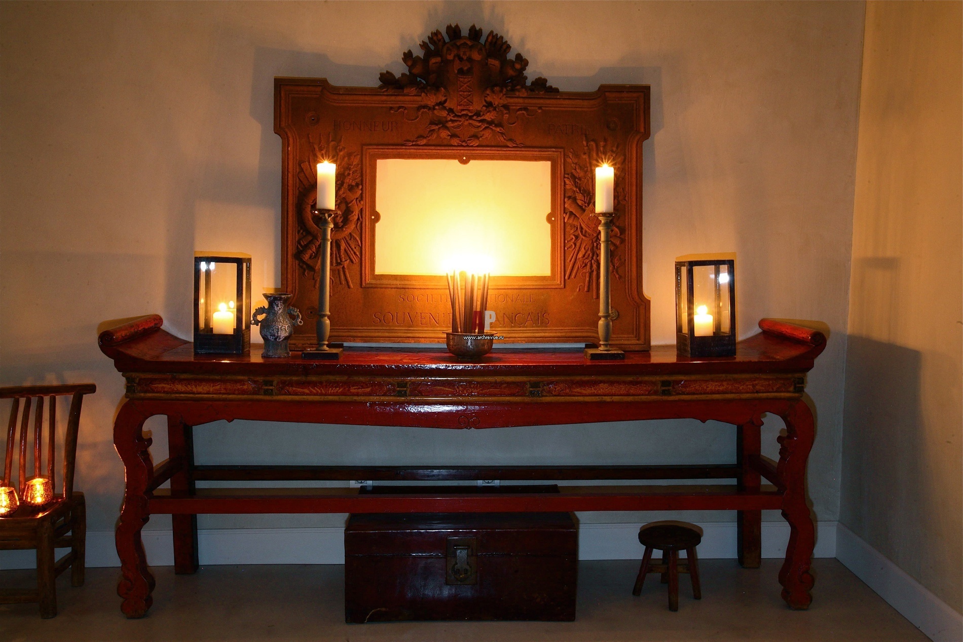Это зеркало – очень дорогая вещь. Те, кто ее продавал, знали, что она уникальна. Зеркало в железной раме принадлежало богатой семье, на раме – семейный герб. Сам по себе предмет просто прекрасен. Нам он подошел и по фактуре и по размеру. На проекте он сочетается с «китайщиной», а подсвечники и подавно – современные, «подарочные», продаются сплошь и рядом…