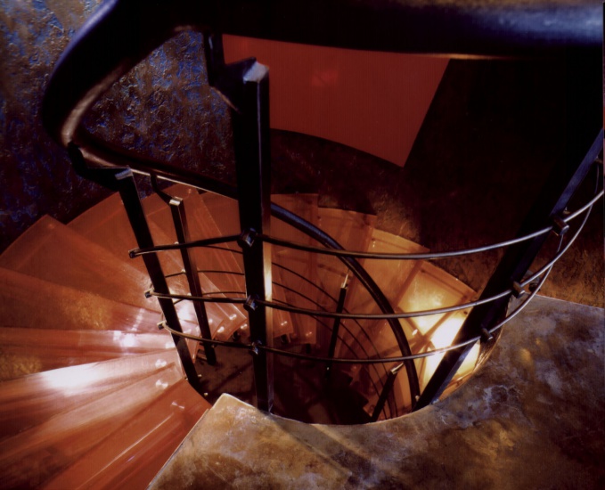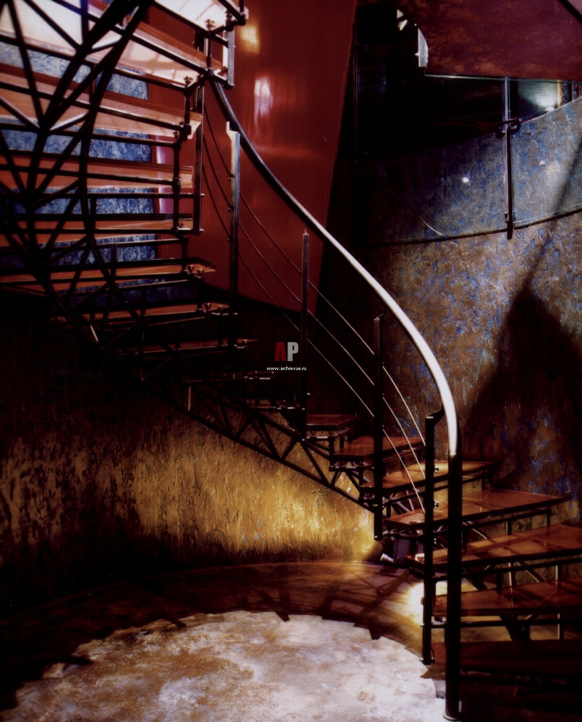 Автор проекта Екатерина Калинина. Лестница в баре, винтовая, ступени – красное стекло.
