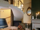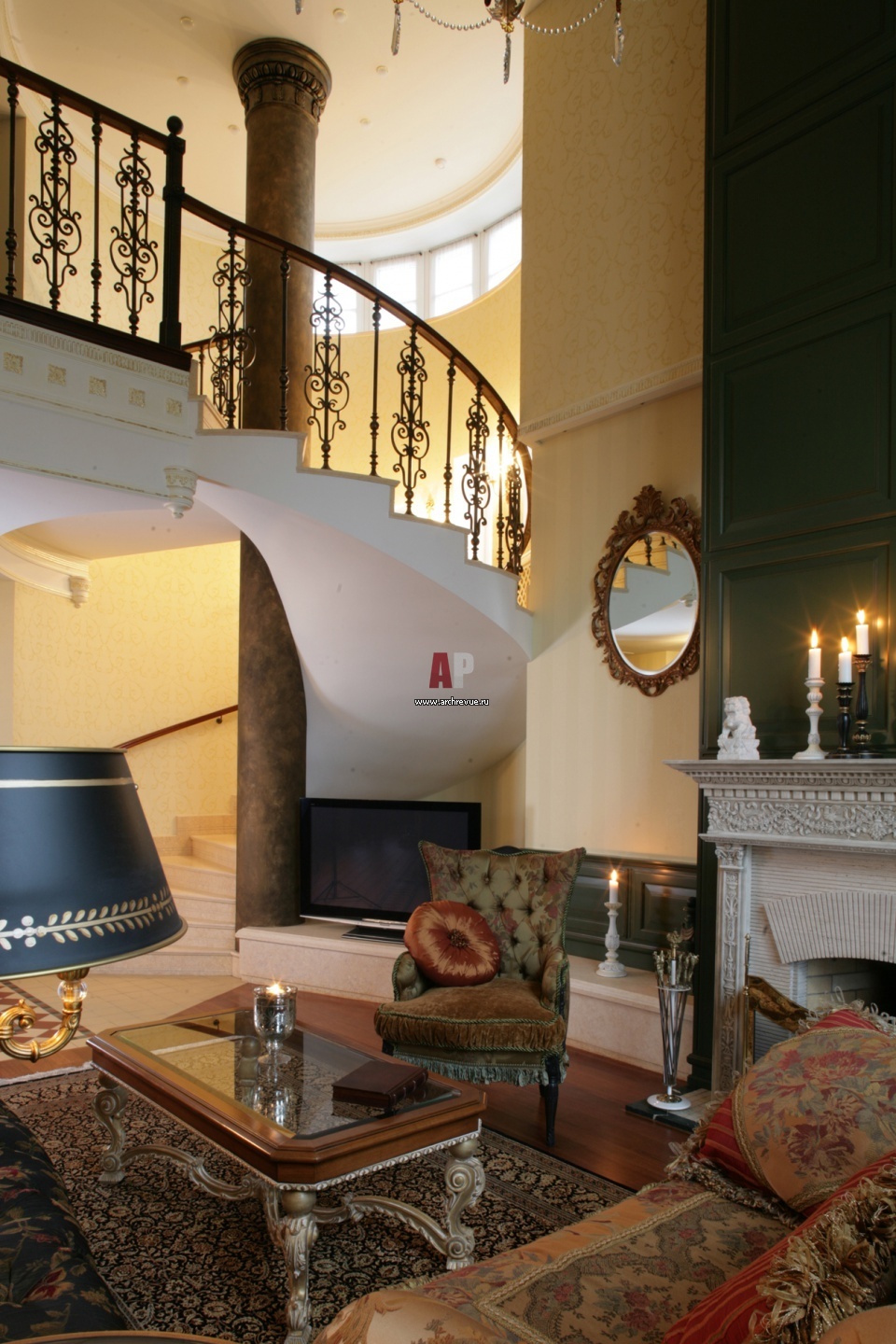 Автор проекта Екатерина Калинина. Лестница в загородном доме, бетонное основание, радиусная конструкция, мраморные ступени, кованые ограждения. Объект см. здесь