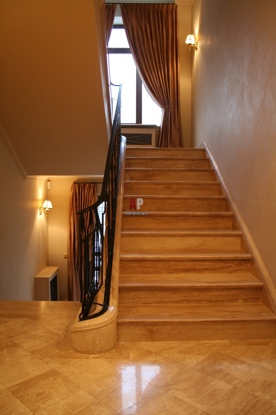 Автор проекта Екатерина Калинина. Лестница в загородном доме, бетонное основание, стандартная форма, мраморные ступени.