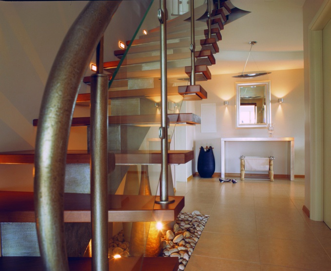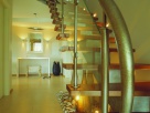Конструктив лестницы может быть разным. Существует бетонное основание, которое потом можно облицевать стеклом, деревом или мрамором. Есть безопорные бетонные лестницы. Среди них не только прямые, но и винтовидные, и спиралевидные конструкции. Преимущество таких лестниц в увеличении возможностей объемного решения. Кроме того, это самый экономичный вариант. Однако они массивны и имеют глухие ступени.