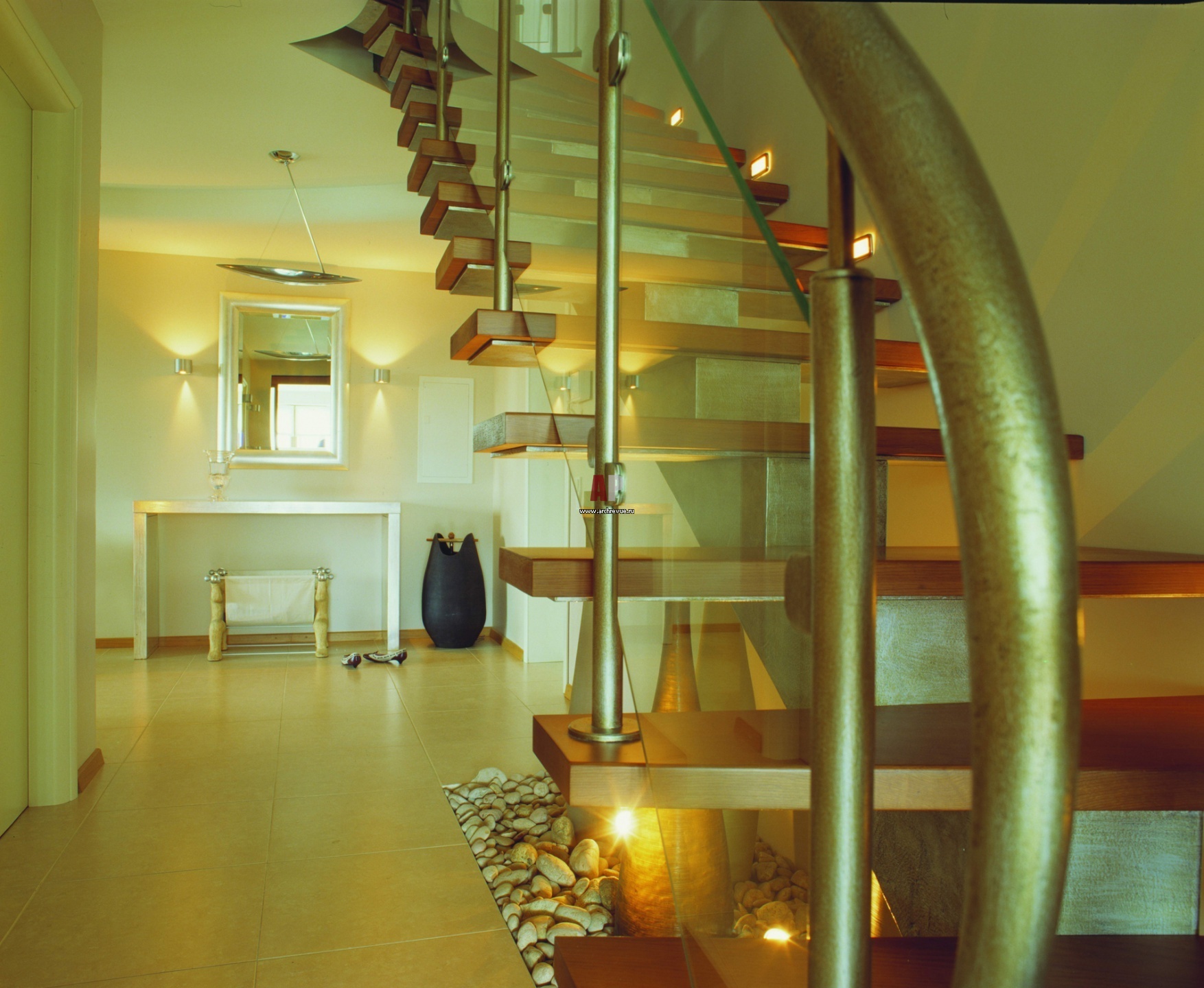 Стекло на ступенях – тоже один из вариантов, который, впрочем, используется реже всего. Стекло выглядит очень эффектно, но царапается, со временем теряет глянец. По опыту скажу, что немногие решаются на его применение.