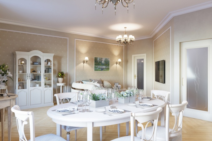 Когда квартира находится в центре, где из окон видны старинные усадьбы - это задает направление и будущему дизайну. Тем более если идея создания аристократического интерьера совпадает с пожеланиями хозяйки квартиры. Выбранный нами стиль можно обозначить как неоклассика. Для него важна симметрия и пропорциональность. При входе в квартиру мы попадаем в просторный, квадратный холл. Нарядная люстра, узорчатый ковер из плитки четко выровнен по центру помещения, зеркало в раме со сложным рельефом подчеркивают соразмерность помещения. Кажется, что это и не холл вовсе , а бальная зала.