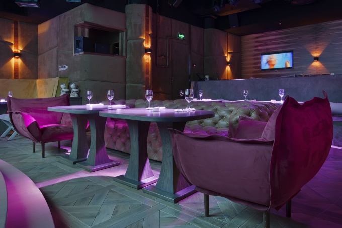 «Luciano караоке» находится на цокольном этаже трехэтажного ресторанного комплекса. Он рассчитан на 50 посадочных мест и оснащен профессиональной сценой. Перед автором проекта стояла задача создать камерное заведение с уютной атмосферой, не прибегая к привычному декору, с которым ассоциируется интерьер караоке.