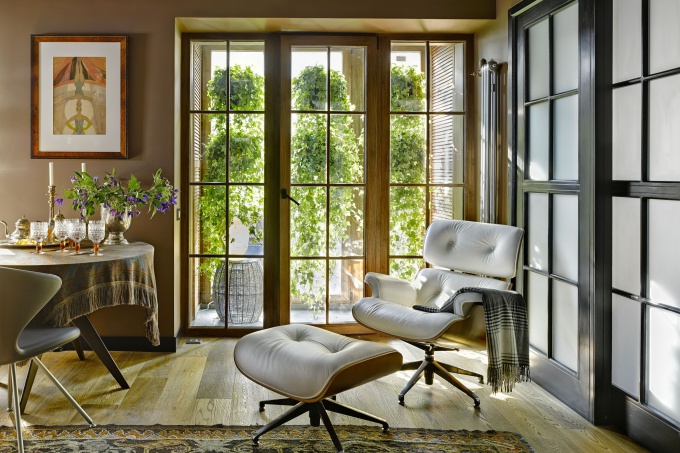 В оформлении интерьера дизайнер делает акцент на светлый фон, дубовую мебель, яркие аксессуары и хозяйскую коллекцию графики и живописи XX века.