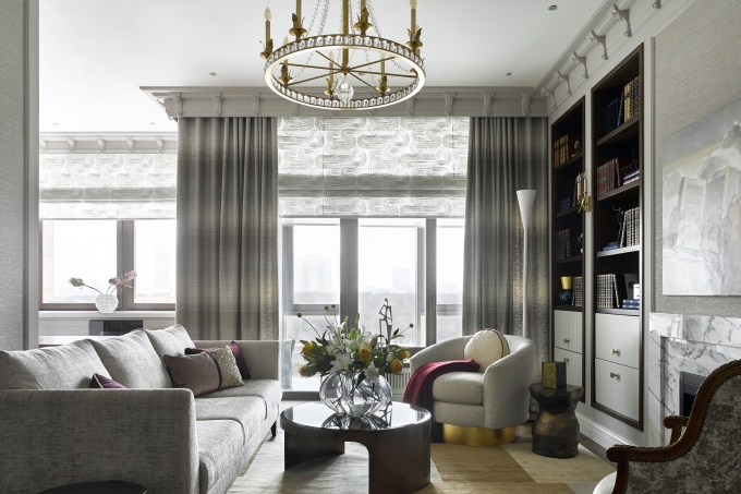 «Холодная серо-синяя гамма была обозначена заказчицей с самого начала, как и стилистика – консервативная, с элементами американской классики», - рассказывает автор проекта. В итоге получился интерьер в сдержанной, почти монохромной палитре, но благодаря гризайльному решению и множеству оттенков он выглядит сложным и насыщенным.