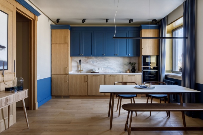 Для молодой семейной пары архитекторы Виктория Косарева и Андрей Надточий спроектировали неординарный интерьер с прозрачными стенами, перегородкой-шкафом из редкого голубого шпона и продуманной до мелочей эргономикой. На 90 кв. м им предстояло разместить гостиную с изолированной кухней и обеденной группой, спальню, кабинет, гардеробную, два санузла и много скрытых мест для хранения.