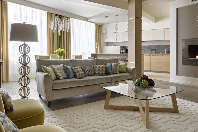 Взглянув на пространство и вид из окон, Алла Шумейко за короткий срок подготовила подробные дизайн-борды и предложила заказчикам строгий и одновременно изысканный интерьер в духе городского шика. За основу она взяла сложную цветовую гамму, построенную на контрасте глухого серого, желто-золотого и цвета спелого лайма, добавила европейскую мебель с намеком на ар-деко, дизайнерские светильники, винтажные аксессуары и предметы современного искусства.