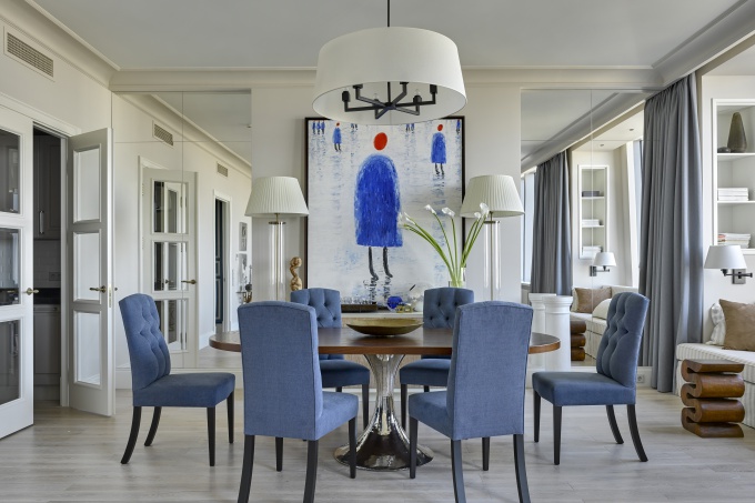 Этот стильный и выдержанный интерьер в нежной жемчужно-голубой гамме с предметами искусства и авторской мебелью мог бы появиться в любой европейской столице. Заказчик обратился к дизайнеру Елене Чабровой с пожеланием создать квартиру в подарок сыну и его юной супруге.