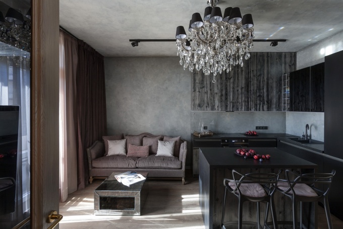 Для молодой девушки архитекторы спроектировали небольшую, но предельно удобную и внешне эффектную квартиру. «Наш ответ Филиппу Старку», - так они назвали этот эклектичный интерьер, где простые формы и брутальные материалы сочетаются с подробными отделками, резными рамами, позолотой и хрусталем.