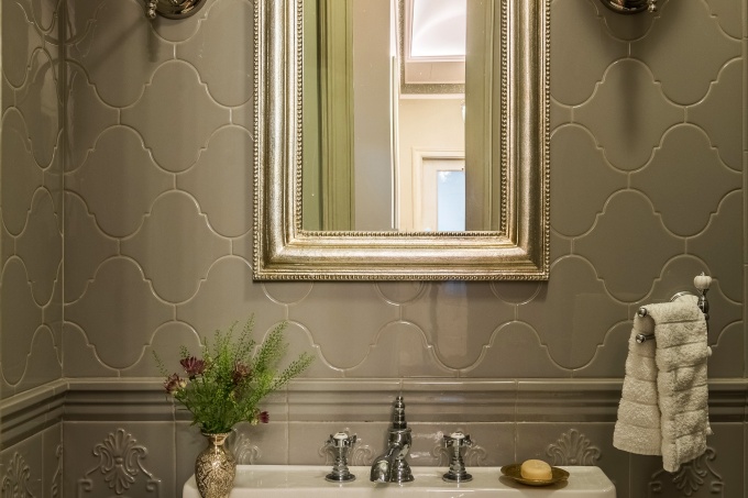 Существует еще одна вариация классического стиля - «утонченная» французская классика, когда стены гостевой ванной комнаты облицовывают мозаикой бордового, золотого и черного цветов, раковину покрывают сусальным золотом. Над ней обычно размещают зеркало круглой формы без багета - его заменяет зеркальный обод.