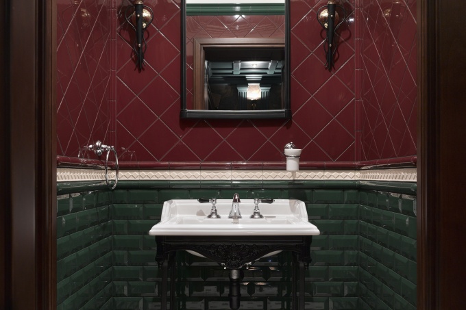 Имеет свои отличительные черты и традиционно классический гостевой санузел. Стены его, как правило, обшитые панелями из красного дерева либо других ценных пород, имеют сложную в исполнении отделку - художественную резьбу, инкрустацию, искусное маркетри. Благодаря виртуозной авторской работе дизайнеров, это помещение становится похожим на затейливо украшенную дорогую шкатулку. Часто прибегают к патинированию стен, чтобы добиться эффекта состаренного золота.