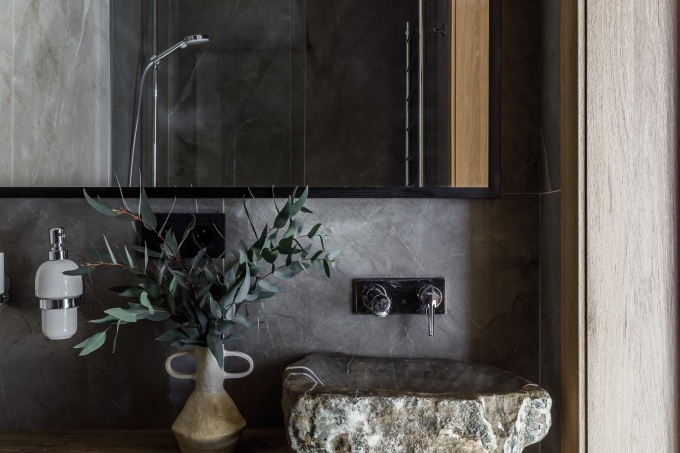 Для его оформления были выбраны исключительно натуральные материалы (мраморная и каменная мозаика, травертин, дерево, минеральные штукатурки, кожа, лен, металл), которые красиво старятся и со временем приобретают еще большой шарм.