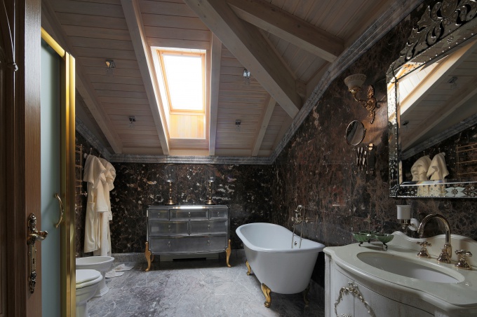 Естественно, в наше время эксклюзивный санузел трудно себе представить без различных современных новшеств, в том числе без бытовой техники. Однако она должна быть тщательно замаскирована (к примеру, за портьерами или мебельными фасадами), чтобы не нарушать аутентичность дизайна и не вступать в дисгармонию с антикварными предметами.