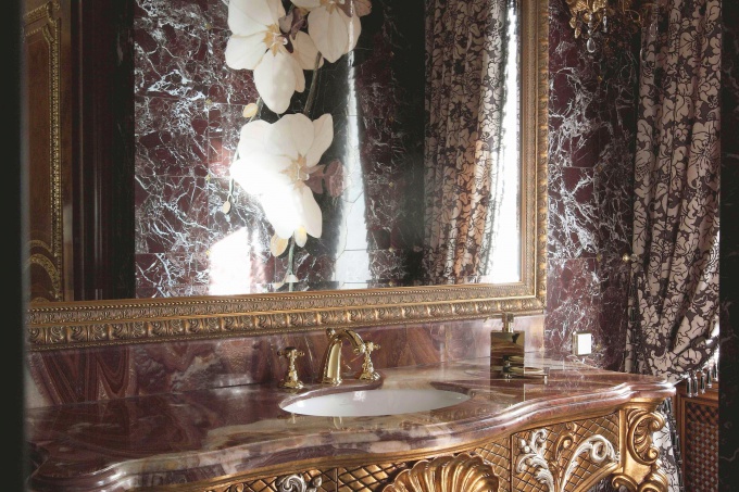 Если вы хотите оформить гостевой санузел в дворцовом стиле, убедитесь, что комната, в которой он будет располагаться, достаточно просторная и светлая. Для реализации подобного дизайна среднестатистическая маленькая ванная не подойдет. В данном случае чем больше будет площадь, тем лучше, так как свободное пространство понадобится для использования различных предметов декора и даже мебели.