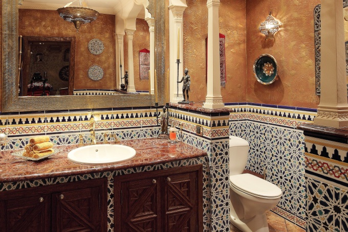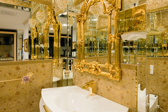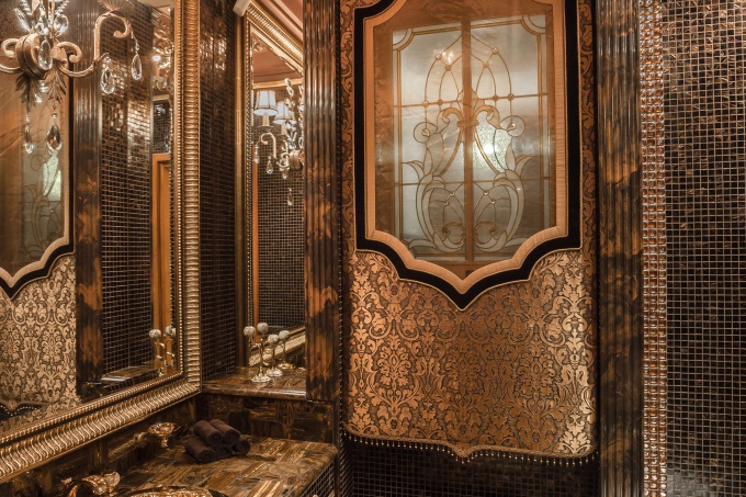 Кроме того, следует учесть, что если классический гостевой санузел может быть освещен лишь точеными светильниками или несколькими бра, то для дворцового дизайна понадобится гораздо больше света. Для этого можно использовать не только обычные светильники, но и большие хрустальные люстры. Чем больше будет света в помещении, тем лучше. Цель этого – подчеркнуть и как можно ярче осветить окружающую роскошь: качественные материалы, лепнину, изысканные элементы декора и т.д.