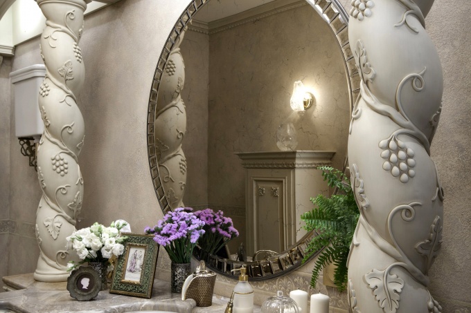 Также интерьер гостевого санузла в дворцовом стиле невозможно себе представить без дорогих и изящных аксессуаров. Для декоративного оформления стен, дверного и оконного проемов часто применяют бархатные или парчовые портьеры с кистями и ламбрекенами. Очень часто для украшения комнаты используются произведения искусства – картины и зеркала в позолоченных рамах с патинированием, массивные деревянные канделябры, мраморные статуэтки и даже статуи, декоративные шкатулки и многое другое. Главное, чтобы все эти предметы создавали атмосферу величия и поистине королевского статуса.