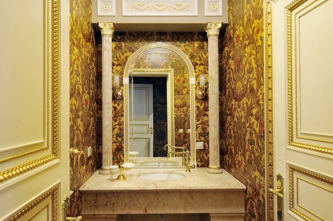 Обязательными условиями такого интерьера также являются уникальность и эксклюзивность. Как в прошлые века, так и сегодня дворцовый дизайн гостевого санузла подразумевает использование исключительно дорогих и желательно натуральных материалов. Так, для отделки потолка наиболее часто используется лепнина из гипса с нанесенной на нее позолотой. Кроме того, для оформления потолочного пространства можно использовать фрески с орнаментами или представляющие собой целые картины в классическом стиле. Стены могут быть украшены деревянными панелями, пилястрами, колоннами, тканевыми обоями или даже гобеленами. Что же касается пола, то для него самыми идеальными материалами будут паркет или мрамор.